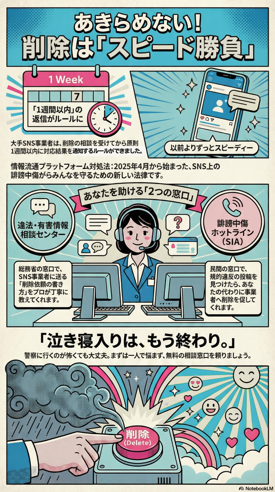 インターネット上の権利侵害に対応するため、法律が改正され「情報流通プラットフォーム対処法」として新たなルールが整備されました(2025年施行)。特に大規模なSNS事業者に対しては、削除申出を受けてから原則として「1週間以内」に判断結果を通知するルールが設けられるなど、以前よりもスピーディーな対応が期待されています。 一人で悩まず、専門の窓口を利用してください。総務省の委託事業である「違法・有害情報相談センター」では削除依頼の方法について助言を受けられるほか、セーファーインターネット協会(SIA)が運営する「誹謗中傷ホットライン」では、利用規約違反の投稿についてプロバイダ等へ削除等の対応を促す通知を行っています。