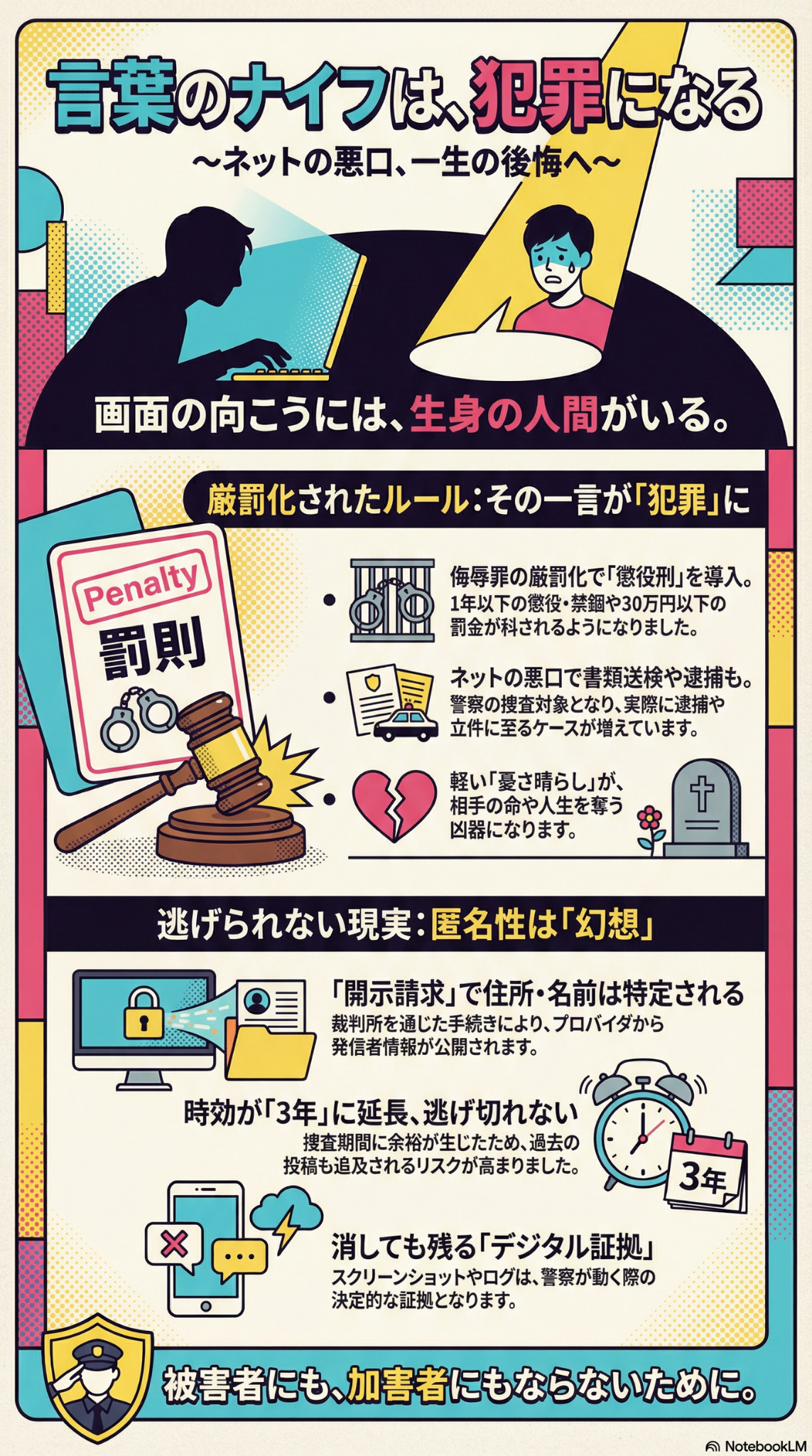 「匿名だからバレない」「少し悪口を書いただけ」という軽い気持ちが、取り返しのつかない事態を招くことがあります。2022年の侮辱罪の厳罰化により、懲役刑や禁錮刑が導入され、公訴時効も1年から3年に延長されました。これにより、過去の投稿であっても捜査や責任追及が行われる可能性が高まっています。 また、2025年の法改正により発信者情報開示の手続きが簡素化され、匿名での投稿であっても、裁判所を通じた手続きにより住所や氏名が特定されやすくなりました。加害者にならないためにも、画面の向こうには生身の人間がいることを常に意識することが大切です。